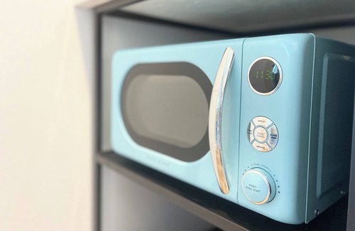Pots and pans • dining ware • cooking and dining utensils • oil/salt/pepper • 5 burner stainless steel stove with oven • knives and cutting board • retro microwave • retro 7cu ft fridge • gooseneck electric kettle • drip coffee maker • coffee and tea with creamer and sugar