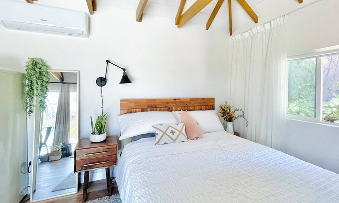 Despite being only 280sqft, it has everything you need—from a private entrance, full kitchen, living/dining area, queen bed, private washer/dryer behind the unit, to a large wardrobe for all your dazzling outfits. It’s nested towards the back of a large-sized property in a quiet LA suburb neighborhood next to the country club. The tiny home is situated on the upper level with the main house on the lower level so you’ll have plenty of privacy during your stay.