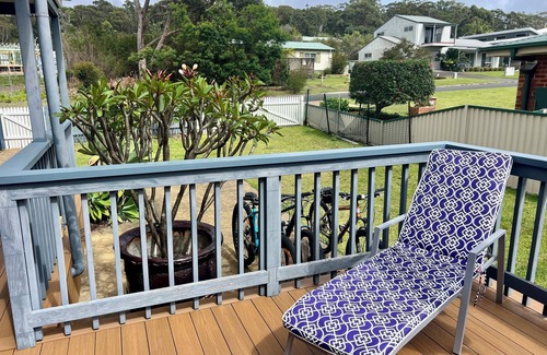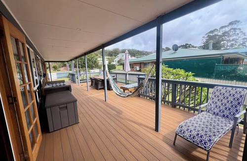 This delightful house offers 4 bedrooms including 2 queen beds, 1 room with 2 x King Singles bed, and 1 room with 2 bunk beds and 2 bathrooms (1 including a bathtub) plus an outdoor shower (with hot water). At this peaceful coastal retreat you can go back in time to when the kids can ride bikes around the quiet streets, it’s a 10 minute walk to the beach, kangaroos graze on the front lawn & the stars are bright in the night sky. The Balinese dining table inside seats 10 & the huge outdoor deck includes 2 day beds, sun lounges, outdoor table seating 10 also.