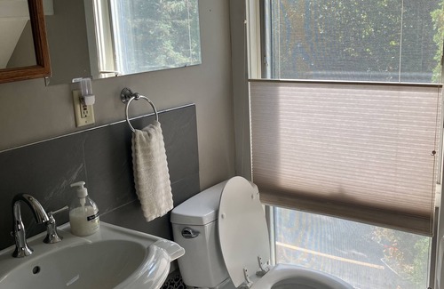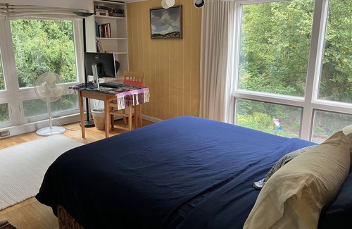 The house is on a quiet road. The big garden is full of colors and plants of all heights.There are no sidewalks, or street lights and houses are far apart so you don’t hear neighbors or loud traffic.The wide wrap-around deck is a pleasure to use especially in summer. When it’s very warm, various frog species croak in concert. The loft apartment has floor to ceiling windows; a light filled space. Most curtains block out light. Wood floors, new bathroom, separate, private entrance via stairs outside. Lots of closet space.Two portable fans and a/c. TV has fire stick.