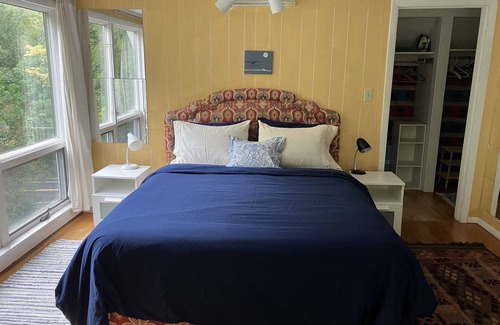 This private, spacious, light filled loft apartment with floor to ceiling windows overlooks private pond, sauna, large garden and woods - the open, uncluttered space and tranquil surroundings are relaxing. Near hiking/biking/running/ski trails, brewery, vineyard, golf course - originally Alice Cook’s house. A queen bed + inflatable bed or rollaway (+1) Safe, quiet, surrounded by nature, wrap-around deck - a peaceful, relaxing, private setting. TV fire stick.