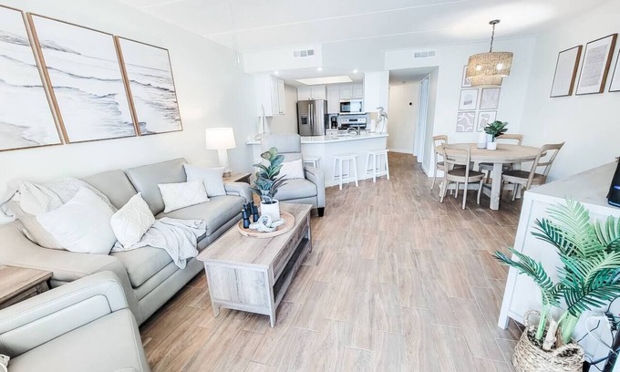 Located on the property is a large, heated saltwater pool! This is as close to the ocean as you can get! This premium corner condo is located on the 3rd floor perfect for beach views both to the North and East. It is directly on the ocean unlike many other condos that have a pool blocking your view of the beautiful Atlantic. The unit sleeps 7. The condo is a 2 Bedroom / 2 Bath accommodation. The master bedroom has a brand-new king bed with premium bedding and linens. The second bedroom is equipped with brand new full bed and a twin bed. All furniture, mattresses and linens are brand new. The living room couch pulls out to a Full Sleeper. The furnishings are all brand new and tastefully decorated with a Boho Beach feel. Full size washer/dryer in unit, along with beach chairs and towels to use! Clean and crisp, this coastal condo is fully equipped and ready for you to enjoy!