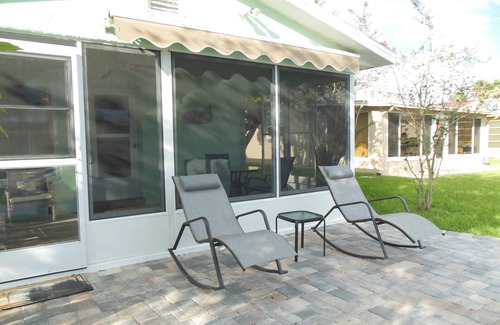 The outdoor patio area has pavers, rocking chairs with a roll out awing. The lower patio area is also covered with pavers has a concrete table. It's great for relaxing and enjoy the boats going by and manatees and dolphins. Fish from the bottom patio or the floating dock.