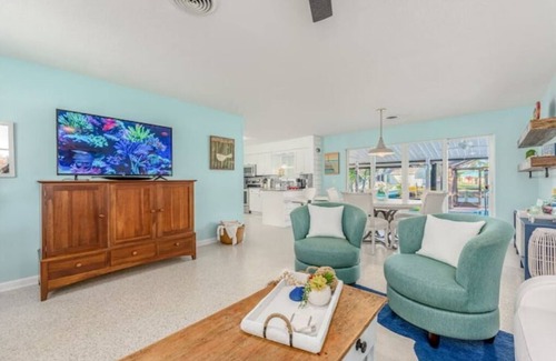 This house has two bedrooms, one bath, a full kitchen, a laundry room, and great living and dining areas, with a TV in each bedroom and living room for entertaining.
