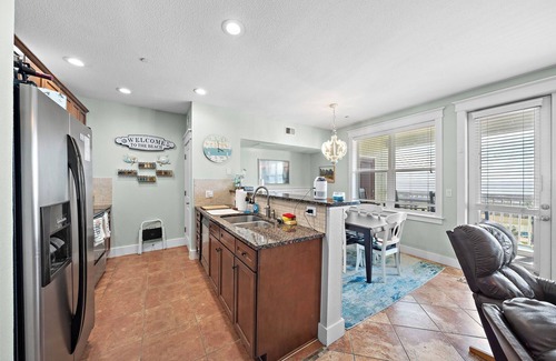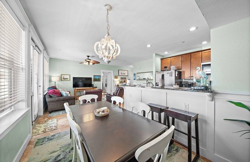 Inside, the condo features a bright, open floor plan that welcomes guests into a spacious living area furnished with a queen sleeper sofa, a dining space for shared meals, and a fully equipped kitchen ready for home-cooked delights. Thoughtfully designed with comfort and convenience in mind, the condo sleeps up to 7 guests. Both bedrooms are cozy and inviting, and two full bathrooms ensure everyone has space to refresh. Pet lovers will appreciate the pet-friendly policy—bring up to two dogs for a small fee. Additional perks include an assigned covered parking spot and a private garage storage unit stocked with beach gear for your use.