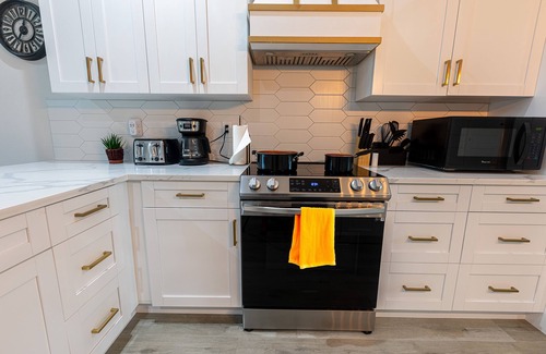 Our fully equipped kitchen includes all the essentials to meet your cooking needs. Enjoy modern appliances such as a refrigerator, stove, oven, microwave, and dishwasher. We provide a full range of utensils and dishes for convenient meal preparation. The kitchen is complemented by a full-size dining table and bar seating, making it ideal for family meals or gatherings.