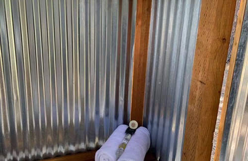 The cottage really is tiny, but functional. The room is 8 X 8 feet with a loft large enough for a twin sized comfy memory pad mattress provided with bedding along with a comfy made up twin sized bed down at floor level. Please only 2 people stay in cottage unless you’re a VERY small person, than maybe 3 people. The door has a dead bolt for extra security if you feel more comfortable using it. Most people will spend daylight outside under the trees in the comfy hammock, sit at the propane fire pit on the deck or at the picnic table. The site is very spacious. You can have 6 added people bring their own tent to stay in for $15 per person. There’s a port-a potty that’s shared with 2 other cottages. If you’re traveling and just want a beautiful place for the night, this is a great place for you! Outdoor cool shower with towels, shampoo, conditioner, body wash and body lotion.