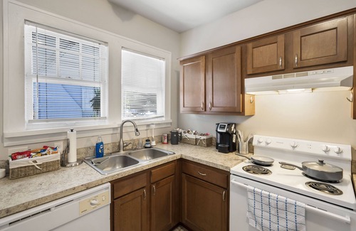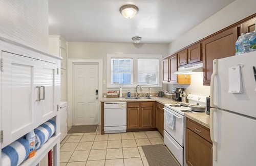 The kitchen is full of snacks, sodas, a bottle of wine for you, and spices/oils/etc for cooking. The kitchen has pots, pans, microwave, toaster, tea kettle, etc. For coffee, there's a Keurig machine with more k-cups then you'll ever be able to drink. And there's also a french press with ground Illy coffee. For you tea drinkers, there's an electric tea kettle with a variety of teas.