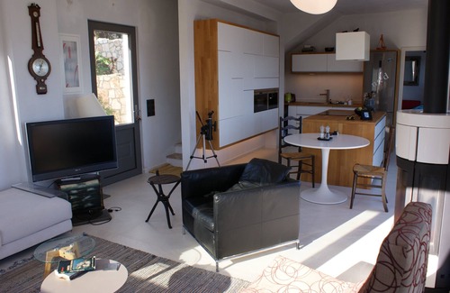 Entering the villa, the ground floor has cool porcelain floor tiling with rugs and provides two lovely rooms: a light and spacious open-plan Kitchen/Diner/Living Room with a modern island style kitchen, cream corner sofas, swivelling armchair, big internet TV, dining table and woodstove. Leading off that is a ground floor Bedroom with en-suite shower/wc, king-size bed and air-conditioning. All these areas have large sliding patio doors with insect screens that lead out onto the big south-facing terrace with its spectacular sea views and colourful plants.