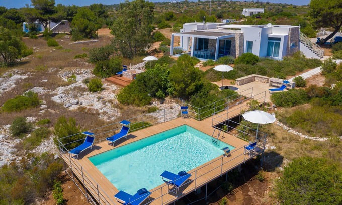 On a hilltop with stunning views, surrounded by nature on a private land of 10 thousand square meters and with an undisturbed 180 degree sea view, a few kilometers from the long sandy beaches of the Ionian Sea, this brand new and highly comfortable villa is the ideal setting for a memorable holiday with your family or friends. Its four bedrooms, four bathrooms with showers, a large private garden with a swimming pool with hydromassage and a stone tub are just some of its highlights. The picture is completed by the magnificent shaded terrace surrounded by lavender and other Mediterranean plants, the numerous solarium areas furnished with deck chairs and sun loungers and a charcoal barbecue.