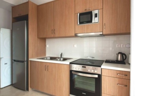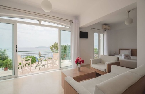 Modern and spacious, this studio is fitted with a king-sized bed and a bathroom equipped with a shower cabin and complimentary toiletries. With a demanding balcony view of the sea, this bright and spacious apartment features a fully equipped kitchen. Each space includes air-conditioning, a flat-screen TV, and a washing machine. Our beautiful spaces eliminate the stress of the everyday, letting the experience with your companion be the focus. Take a stroll along one of the beautiful Greek beaches on the island, sip coffee on the balcony, and please enjoy your stay.