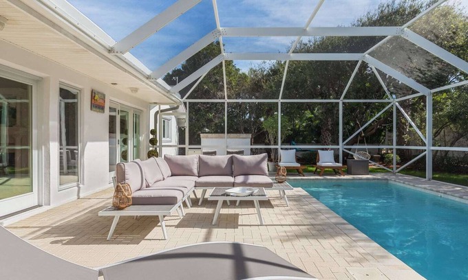 Step out back and you'll find a HUGE caged lanai area with luxurious mid century patio seating surrounding the HEATED in-ground pool. You’ll be pleasantly surprised by the quality and variety of pool toys to enjoy the refreshing pool water. Enjoy your wine at the Locally handmade surfboard bar situated by the pool. The friendly fun continues outside of the lanai with more comfortable seating and a nearby ping-pong table and a cornhole bags set.