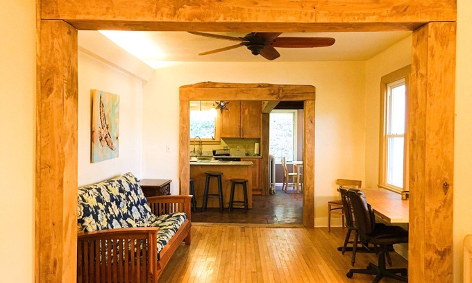 This adorable private house is perched up in the trees across the street from Six Mile Creek. It's only a 10 min walk to the downtown Ithaca Commons bars, restaurants and the State Theater, but you are in the woods. Walk to Cornell in 24 min. Enjoy beautiful views through all the windows, and hopefully you will spot the family of deer who live in the back. Three private bedrooms sleep 6 comfortably and 3 more can sleep on the futon sofas in the common space. Local artists are showcased. We have been renting the house out to happy guests for years (search for Tree House in Town Ithaca)