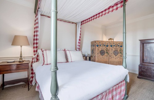 Sitting at the top of the handsome main staircase is this pretty and light-filled bedroom featuring a king-size bed on an antique, French bedframe, with sweeping curves, cabriole legs, an upholstered headboard and a statement canopy. To either side are bedside consoles, while an antique desk with a pretty swing-back mirror and an occasional table provides plenty of space for personal items. A tall boy sits in one corner, providing hanging space and drawers, and there's an original fireplace (non-working) with a stunning marble surround beside the window.