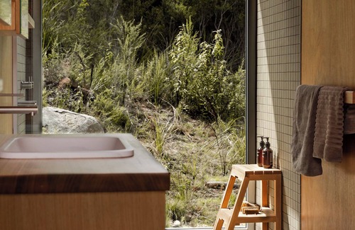 The shower ensuite is green and serene with a window through to the bush. Soft cotton towels and Aesop hand wash and moisturiser, shampoo and conditioner and body wash are supplied.