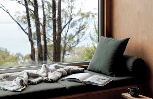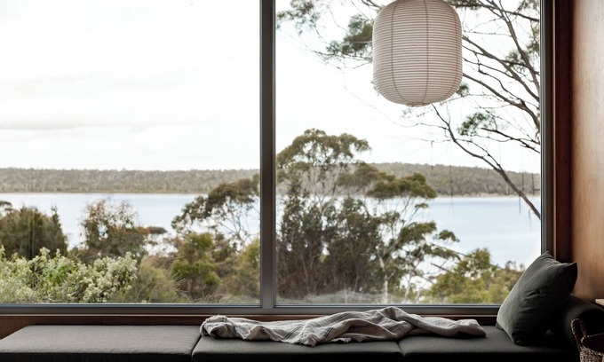 Extensive double glazing brings nature’s finer details close-in to the living spaces while also drawing to the wider view. You may glimpse pademelons scuttling into the bush and superb fairy wrens darting around the native grasses in the courtyard. Sea eagles, black cockatoos, and pelicans fly above the treetops, while black swans gather on the bay below.