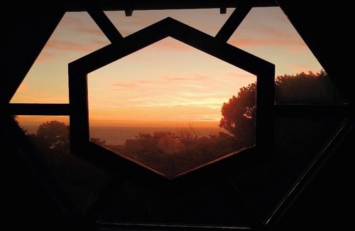 Downstairs there is a queen sleeper sofa with a flowering garden and pond just beyond the triangular glass paned windows. The spiral staircase leads to a airy room with a queen bed. In winter you may see the grey whales as they migrate down the coast of California, and in the Spring the headlands are covered with wildflowers. The galley kitchen, where simple meals can easily be prepared, opens onto a garden patio where you can enjoy your meal, or there is a cozy dining area in the main living space.