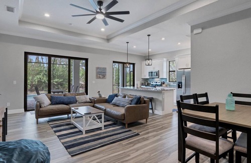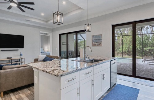 Great room open floor plan with comfortable leather sofas, cocktail tables and dining area, lead to fully equipped kitchen with stainless appliances and granite countertops. Barstools at the island for casual dining. Large flat smart TV on the wall to enjoy your various apps. There is a laundry room off the kitchen with a washer and dryer.