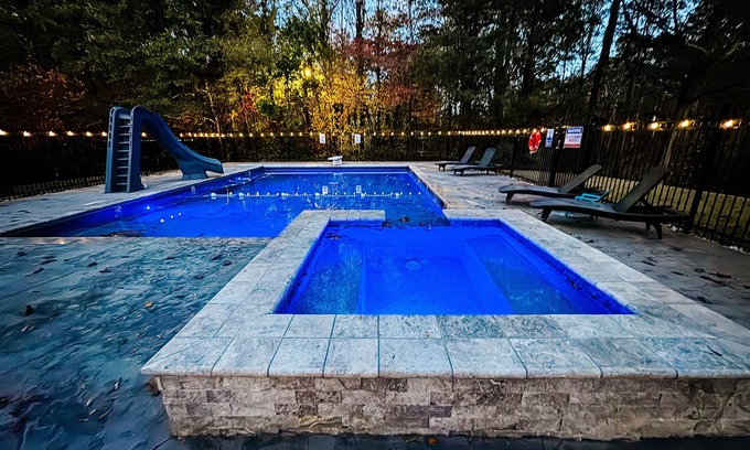 - Pool and Hot Tub: The large pool features a sunbathing shelf, slide, and jumping board (no diving allowed), while the hot tub is perfect for relaxing under the stars. (Note: Pool and spa heating are complimentary when temperatures are above ~40°F. Below this, the pool and spa go into freeze protect mode and cannot be heated.). Note: The hot tub is fully functional and safe to use, though you may notice minor cosmetic repairs in the plaster from previous ground movement. A full resurfacing is scheduled during the off-season when heating can be paused.