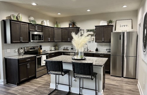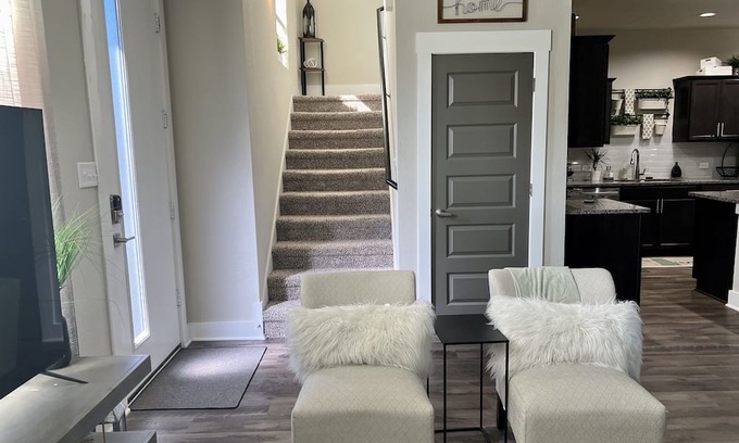 Relax in this calm, stylish townhome! Have fun with the whole family or just enjoy a weekend get a way at this stylish place. The contemporary home sleeps up to 8 guests with one extremely comfortable king bed in the primary room, one queen bed with pond views, 2 twin beds with pond views and a queen air mattress for additional guest. Pets are welcome with fee. Pets get their very own little room, too! Great location in South College Station! Plenty of room for professionals looking for work stay, families looking for a short term stay (Additional discounts for stays over 30 days) or groups visiting the area. Home comes with stylish finishes and large TVs (3) for viewing your favorite sports! Home also offers EV car charging for Tesla in the spacious 2 car garage, including a home gym! This home has beautiful views of the community pond with great walking trials right in your backyard! You won't find a more fun, more convenient, more stylish or comfortable rental in Aggieland! Perfect location in the sought after South College Station! This home is 10 minutes from Kyle Field for all those Aggie football games. Also conveniently located to several popular dining spots. Short distance to neighboring Tower Point and Jones crossing Shopping Centers including HEB, retail, and restaurants! Our approach is self check-In but I am available should you have any questions or concerns. I live just a few miles away! I look forward to having you as my guest.