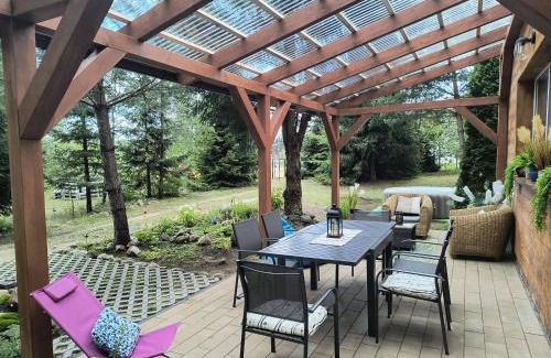 Featuring a garden, Sworny Bór- całoroczny offers accommodations in Swornegacie. This property offers access to a terrace and free private parking. On clear days, guests can head outside to enjoy the vacation home's outdoor fireplace or simply kick back and relax. With free Wifi, this 2-bedroom vacation home features a flat-screen TV, a washing machine, and a fully equipped kitchen with a dishwasher and oven. Towels and bed linen are available in the vacation home. There's also a seating area and a fireplace. A mini-market is available at the vacation home. The area is popular for cycling, and free use of bicycles is available at the vacation home. The vacation home has a picnic area where you can spend the day outdoors.