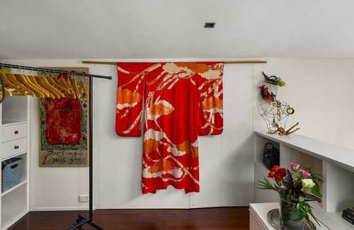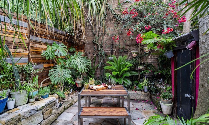 As you step through the front door, you'll be greeted by a cozy living area adorned with funky furnishings and original stone walls, creating an atmosphere that is both inviting and enchanting. The upstairs queen bedroom boasts a comfortable bed with vista's onto the garden oasis, ensuring a restful night's sleep after a day of exploring the vibrant streets of Sydney or hard day at the office.