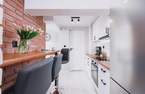 The apartment is located on the underground floor of an atmospheric tenement house and can accommodate 4 people. The space of the apartment offers two bedrooms, an independent kitchenette and a bathroom with a shower. Bedrooms equipped with comfortable beds, wardrobes and desks allow you to work remotely and at the same time to fully relax. The apartment is distinguished by a modern arrangement and functionality. Unusual design and comprehensive equipment with the necessary kitchen and bathroom accessories guarantee a comfortable stay. The arrangement of the space and stylishly selected interior colors in shades of white and gray emphasize the high standard of the apartment.