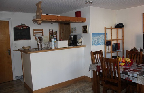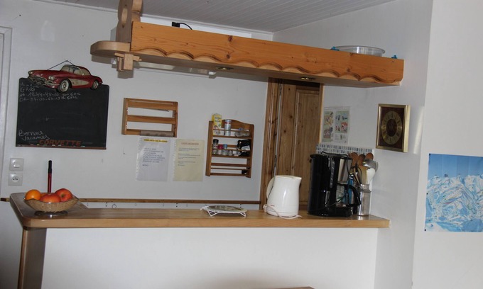 This apartment is designed to accommodate four people and has an equipped kitchen, fridge, microwave, kettle, toaster, raclette set, fondue set, coffee maker, d '' a washing machine and a vacuum cleaner with a 82 cm full hd flat screen TV with TNT reception.