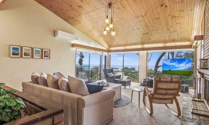 Spacious and inviting, this coastal retreat offers generous living and entertaining areas with stunning sea views from the lounge, kitchen, and deck. Both bedrooms feature queen beds and split-system air conditioning for year-round comfort, with an additional split system in the lounge. Relax by the open fireplace on cooler nights (please note: wood not supplied), or enjoy the large backyard, perfect for families or groups. A queen sofa bed in the living area allows the property to sleep up to six guests; please note, linen is not supplied for the sofa bed—guests must bring their own.