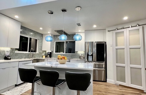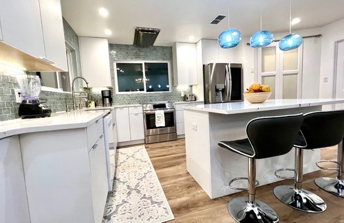 The Kitchen is the Heart of the Home, and is well appointed and stocked with everything required to prepare and serve the most Complex Recipes. The Kitchen is completely open into the Dining Room where the wood silver glimmer table seats 6 Comfortably. The counter island bar seats an additional 2-3.