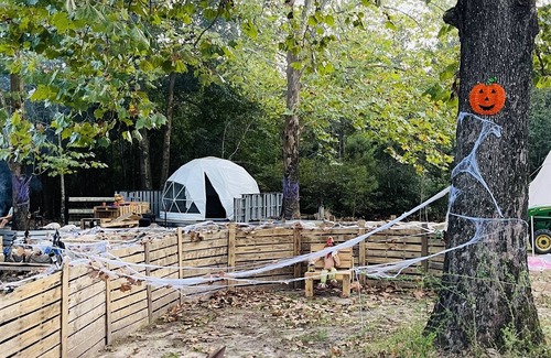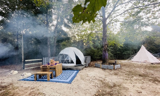 GEODOME- NEW LISTING-Make yourself at home in our unique themed glamping offerings. From the domes to our canvas glamping tents and TeePee tents, all nestled in nature. They have been beautifully furnished with mattresses, indoor and outdoor lighting, along with other perks. We provide two bottles of water upon arrival. Custom pallet platform beds- TWO Twin XL beds. (can push to queen but makes it very tight in unit) Also includes One futon couch for two kids or one small adult.