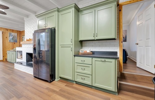 Park your car under the carport, and enter the home from the lakeside, via 3 steps up to a covered entrance. Walk into the living room, and be greeted by tongue in groove pine walls and white wood ceilings. Sit back in 4 reclining seats, and watch a ball game on the 75" LG Smart TV. A short hallway takes you to the main bedroom, bath, and kitchen. From the open kitchen/dining area there are 2 steps leading up to the other bedrooms and bathroom.