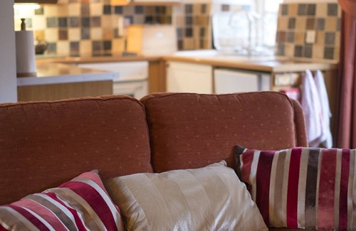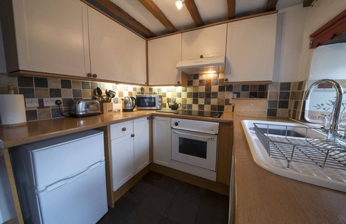 Entrance into open plan living area, warm and inviting the sitting/dining area enjoys comfortable seating, log burning stove, TV, DVD & CD player and exposed oak beams. The perfect place to relax after a day exploring the local area. The small kitchen is adequate for two and benefits from electric oven, hob, fridge, microwave & dishwasher.