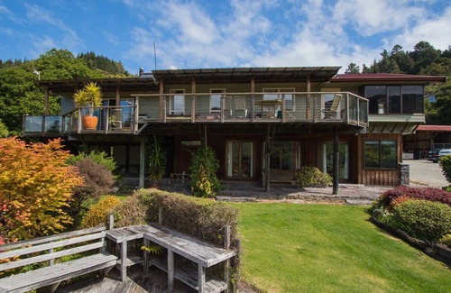 Set among lush, tranquil gardens, Tasman Hideaway is a 4-bedroom 3-bathroom Marahau holiday home with Wi-Fi. Perfect for a secluded retreat, this spacious house enjoys ample indoor/outdoor living space just minutes from the waterfront, and 800m away from the start of the Abel Tasman Walking track and the Park Cafe!