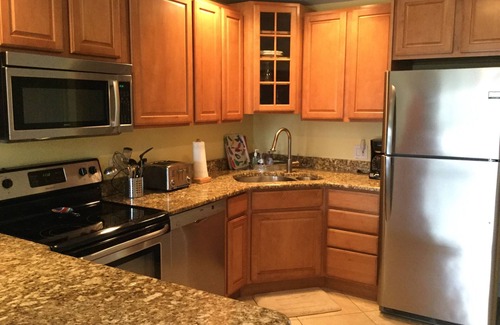 Our totally updated condo is located in a 24 hour security gated community. Upon your arrival, you will be greeted with beautifully groomed grounds and a myriad of amenities to provide you with a wonderful experience. There are 5 heated swimming pools, hot tub, 6 shuffle board courts, 3 bocce ball courts, 10 tennis courts, a 9 hole- par 3 executive golf course, and a fitness center with sauna . A Tiki Bar is located adjacent to one of the pools, and there is also a restaurant available on site. Or you can just relax on the 3,000 feet of private ocean beachfront . Our second floor condo has a King Bed in the master bedroom, ceiling fan, and flat screen TV. The living room has a couch and ottoman. Comfortable chair and coffee tables, flat screen TV with a DVD/Blue Ray player. Cable and high speed WIFI is provided. The kitchen is fully stocked with all new appliances and accessories. Linens are provided for the unit, including beach towels. A washer and dryer are also in the unit. There is an enclosed lanai with seating for quiet evenings overlooking the water and water courtyard fountain. Whether you are looking for an activity filled month or a time for relaxation and rest, you will be truly satisfied vacationing at our lovely Ocean Village condo. Please review the rental agreement on the VRBO site.