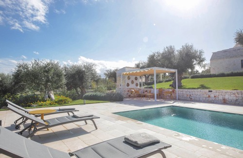 Trulli Lorusso is a typical complex of cones and lamia finely renovated, preserving the unique characteristics of these particular country houses. Trulli Lorusso is located just 2 km from the centre of Castellana Grotte in a panoramic area with terraced land, near the 'Grave', the chasm through which you can access the famous ""Grotte of Castellana"", a site of national speleological and tourist interest. The property is totally fenced in, and has an electric gate and private parking. At the front of the house we find a large patio that accommodates the outdoor kitchen, with a barbecue and a table and chairs for maximum conviviality. From here we can see the salt swimming pool, in a position underneath the house, surrounded by a solarium area with sunbeds and shade for maximum relaxation, an outdoor shower to serve, and a garden with lawn and olive trees.