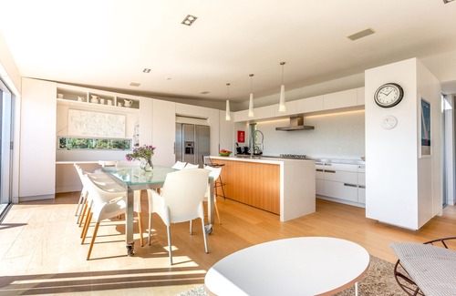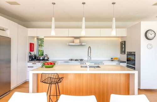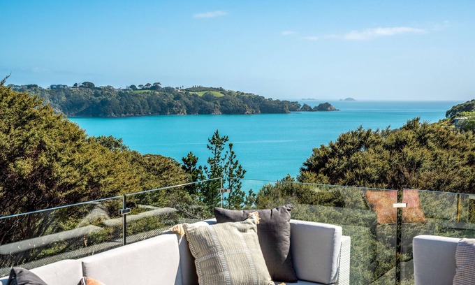 This wonderfully stylish house has been architecturally designed to make the most of the wonderful Northerly sea views, and looks out across Little Oneroa and out to Oneroa Bay. It is a perfect location - extremely private and yet minutes walk to Little Oneroa Beach and Oneroa Village with it’s shops and restaurants. No need for a car!