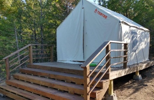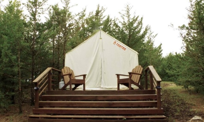 Each campsite includes a 10'x12' safari-style canvas tent on a raised platform, and you'll find one queen bed or a queen-size bunk bed inside (each site is different, see photos for the exact setup). Larger groups can also use the extra 5-person pop-up dome tent that’s provided (you’re welcome to bring your own camping gear too). You'll also have a 6-ft picnic table, outdoor fire pit, 2 Tentrr Adirondack chairs, and a heating source to keep you warm and toasty at night.