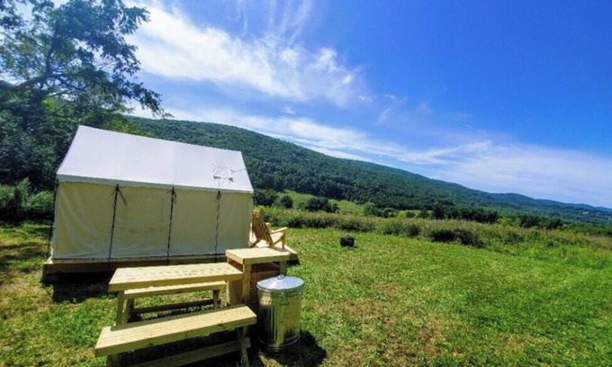 Breathtaking views from the highest point on our farm. Enjoy the stars at night and sweeping view of hills and valley directly from your tent site. Access your site directly and privately from the main road via a tractor entrance. You can park at the bottom of the ridge and walk only 2-3 minutes up the mowed path to your private tent site, under the shade of many beautiful large trees. 4-wheel drive vehicles can park directly at site.