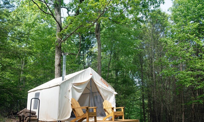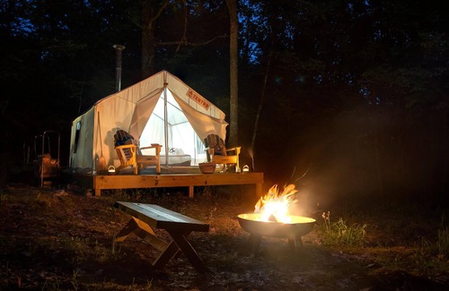 Each campsite includes a 10'x12' safari-style canvas tent on a raised platform, and you'll find one queen bed or a queen-size bunk bed inside (each site is different, see photos for the exact setup). Larger groups can also use the extra 5-person pop-up dome tent that’s provided (you’re welcome to bring your own camping gear too). You'll also have a 6-ft picnic table, outdoor fire pit, 2 Tentrr Adirondack chairs, and a heating source to keep you warm and toasty at night.