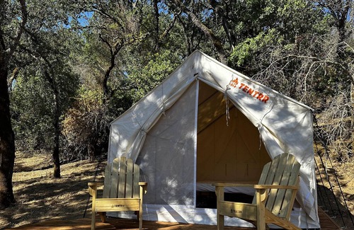 Your Tentrr campsite includes a 10'x12' (120 square feet) safari-style canvas tent on a raised wooden platform. Inside the tent you'll find one queen bed with a memory foam mattress. The tent is big enough for the bed plus one or two extra sleeping bags on the floor. Aside from the canvas tent, campers can also use the extra 5-person pop-up dome tent that’s provided. You'll also have a 6-ft picnic table, outdoor fire pit, and 2 Tentrr Adirondack chairs.