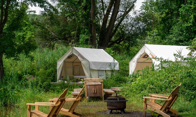 Each campsite includes a 10'x12' safari-style canvas tent on a raised platform, and you'll find one queen bed inside. Larger groups can also use the extra 5-person pop-up dome tent that’s provided (you’re welcome to bring your own camping gear too). You'll also have a 6-ft picnic table, outdoor fire pit, 2 Tentrr Adirondack chairs, and a heating source to keep you warm and toasty at night.
