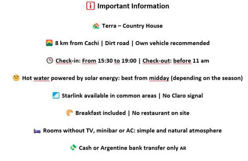 This Terra - Casa de Campo in Cachí is well equipped and has all facilities that have been listed below. Please note that these details were shared to us by booking.com for the listed “Terra - Casa de Campo”. We solely rely on their shared details and are regarded as “accurate”. If you have any concerns about the information or accuracy describing this Bed & Breakfast, please let us know.