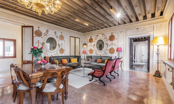 Seek out the surprising ‘Tesori di Celestia’ - Treasures of Celestia - a beacon of antique & designer chic in the Castello sestiereLounging languorously behind a grand 15th century palazzo facade in one of the last remaining pockets of solidly traditional Venetian charm, this treasure trove apartment swaddles 8 in a stuccoed wonderland of time-honoured elegance and aristocratic good tasteWearing the patina of its past with customary Venetian aplomb and harbouring a marvelously curated mélange of ancient beams, gleaming terrazzo and dazzling chandeliers offset with ‘of the moment’ furnishings fully in tune with modern times, the freshly renovated Tesori di Celestia comprises 4 bedrooms & 3 bathrooms arranged in 2 semi-independent apartments* connected by stairsPromising Wi-Fi and air-conditioned*** luxury in an atmospheric setting a few paces from the virtually undiscovered Campo De La Celestia, accommodation is spread over 2 floors of the palazzo and comprises: Ground FloorA private internal entrance into…A newly created 1 bedroom & 1 bathroom pied-à-terre with wooden beams and terrazzo flooring, perfect for cosying up or hunkering down (!) and comprising:· An attractively furnished open-plan main living space with a sitting/dining area dressed in a fresh, modern style with an L-shaped sofa, a dining table, plus an up-to-date and fully equipped kitchen at one end with marble splash-back· An inner hallway with built-in wardrobe leading on one side to a bijou double bedroom with double bed, and an ante-room with washing machine on the other which in turn leads to…· A luxurious dove grey marble-clad bathroom with up-to-the-minute oval bathtub and separate showerA monumental stone staircase rises up from the ground floor to the…First FloorHome to a remarkable 3 bedroom & 2 bathroom apartment reached via a private internal entrance and comprising:· A breathtaking sitting/dining room - ravishing in its use of colour - spectacularly adorned with intricate 16th century stuccos, painted wooden beams hung with a Murano chandelier, mirror-like polished terrazzo and a wonderful mix of antiques offset with plump teal-blue velvet designer sofas and a mix of modern lighting - a match made in heaven!· An up-to-date and fully equipped kitchen to the side with marble splash-back· An enormous master double bedroom/boudoir where the atmosphere of the palazzo’s history well and truly comes alive! A bedroom to remember - furnished with a wonderfully romantic four poster double bed, a scattering of period pieces, a modern chaise longue - the highlight of which is a spectacular marble fireplace (now used as a bookshelf) fringed with delicate lace-like stuccos which are echoed around the room· A dainty jewel-box of a twin bedroom with 2 single beds sitting beneath a pair of chandeliers and gilt rococo over-mantle mirrorsAnd on the opposite side of the apartment…· A sweet double bedroom - smaller and simpler in style to the others - with a double bed and a pristine en suite dove grey marble-clad bathroom with showerAnd finally, just off the apartment landing… · An additional deluxe bathroom matching in house-style and colour with trendy oval bathtub and separate shower* Note that the 2 apartments are not available for individual rental (i.e. they must be rented together) and so they are ideal if 2 members of your group would like a little more autonomy/privacy!OUR COMMENTYour bounty awaits you on your Venetian voyage of discovery - tucked away off the beaten path but only a short stroll to St. Mark’s square!A characterful apartment in a remarkably unspoilt area shared with a barely discernable trickle of inquisitive and well-informed visitors seeking out the 'genuine' everyday Venice of gently flapping washing lines, sun-dappled courtyards and characterful calli - yet still close to the action if you want to get busy about townWithin steps of the peaceful Palladian church of San Francesco della Vigna (St Francis of the Vines) with its soaring bell-tower and delightfully peaceful cloisters, and on the 'right' side of town for visiting the Biennale Pavilions at Arsenale and GiardiniA gentle walk to the imposing Basilica di Santi Giovanni e Paolo (one of the largest churches in Venice and burial place of no fewer than 25 Venetian Doges), the richly atmospheric Scuola di San Giorgio degli Schiavoni with its paintings by Carpaccio, and to the 'Questura' office of Donna Leon's fictional Commissario Guido BrunettiAlso within a stone’s throw of a 'Punto Simply' supermarket near San Lorenzo and the small local shops of Salizada San Francesco and Barbaria Del Tole for all your self-catering needs… and only 150m to the Vaporetto (water bus) stop at Celestia (with no bridges to cross in between) for travel around the city, trips to beaches of the Lido and visits to the glass-blowing island of Murano, the rainbow-coloured island of Burano and the ancient island of Torcello with its 7th Century Cathedral of Santa Maria Assunta ***Please note that the operation of air conditioning and heating are subjected to the municipality regulation. Generally, the heating works from middle of October to middle of April, while air conditioning works between middle of Aprile to middle of October. Please contact us for further information. For arrivals between 8.00 p.m. and midnight there is an additional cost for "late arrival" of Euro 50, to be paid in cash upon arrival. We organize arrivals between midnight and one o'clock with an additional cost of Euro 100, after this time we reserve the right to accept the customer always with a supplement to be quantified according to the time of arrival.