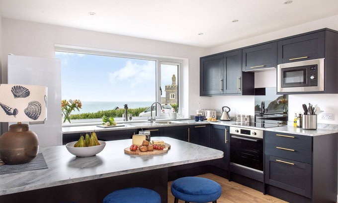 The open plan kitchen leads into the large living room fitted with a smart tv and comfortable settees and sofas, there are also board games and books provided for your leisure. The dining area is situated in front of the double sliding glass doors that lead out onto the balcony. The balcony has tables and chairs under an overhanging roof enabling you to take in the amazing sea views and coastal air during your stay.