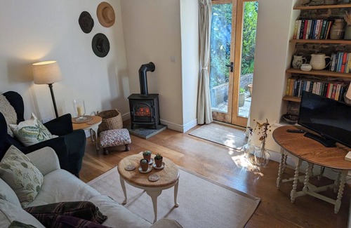 The kitchen leads down three steps into the cosy sitting room. There is a smart TV and WiFi is available throughout. Sitting on either the sofa or armchair allows a view through the French doors of your private enclosed cottage garden.