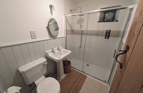 The bathroom offers a large walk in rainfall shower with excellent water pressure. There is underfloor heating throughout the cottage.