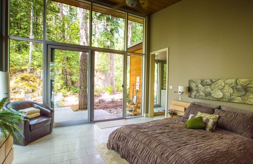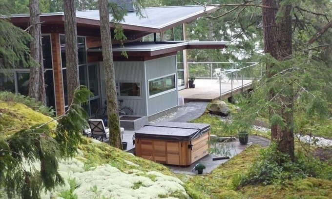 Private and peaceful, the Aerie is perched on the edge of a moss and lichen-covered bluff in the open arbutus and fir tree canopy offering intimate views of the surrounding forest as well as the rugged coast.