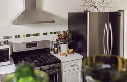 The kitchen is set up to indulge those ambitious recipes you’ve been waiting to try. Fully equipped with ample counter space, a gas-range stove and a full-size fridge, this domain is yours to master. Picture yourself easing into the day with breakfast out in the garden.