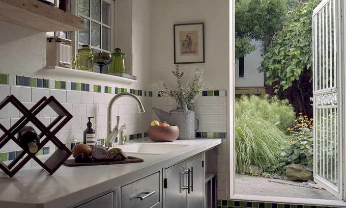 The bathroom offers a serene moment overlooking the garden. Have a soak in the original porcelain + cast iron tub, or escape under the chrome rainfall shower.